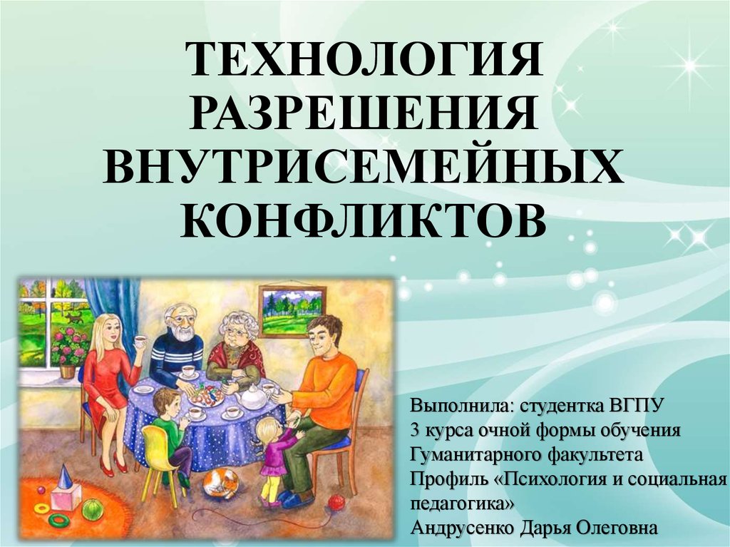 Внутрисемейные конфликты представляют сбой противоборство между членами семьи. Возникает оно вследствие столкновения разнонаправленных взглядов и/или мотивов. Внутрисемейные конфликты обладают своими особенностями, которые нужно учитывать для предупреждения и разрешения этих конфликтов.