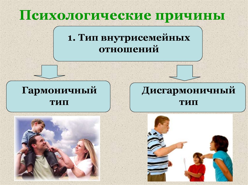 - Характер отношений внутри семьи. Отношения могут быть гармоничными и дисгармоничными. В гармоничной семье сохраняется баланс между психологическими ролями всех членов семейства, и формируется семейное «Мы». В дисгармоничных семьях наблюдаются конфликты между супругами, психическое напряжение, невротические расстройства и хроническое беспокойство у детей.