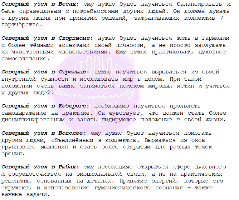 В одной из прошлых статей я писала о том, что такое узлы, и как они влияют на нашу жизнь. Если коротко, то южный узел указывает на качества и свойства нашего характера, с которыми мы рождаемся и на которые опираемся. Это наша семья, в которой мы выросли, и отношения в ней. Северный узел символизирует те качества, которым мы должны научиться.