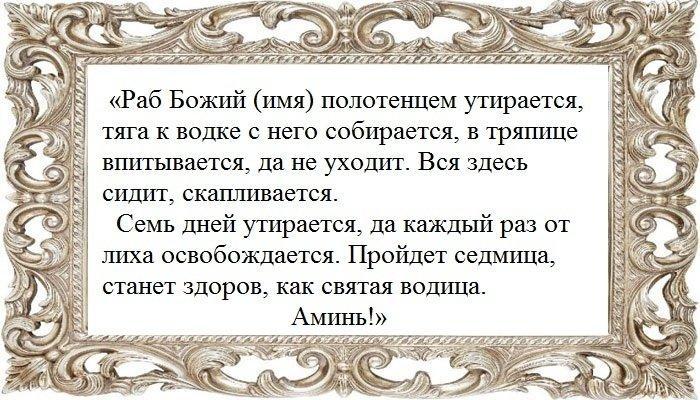 «Господь Бог, прошу у тебя помощи! Хочу избавить зависимости раба Божьего (имя больного), заговор от пития алкоголя сделать, отучить его от пьянки, забрать у алкоголя. Сделай так, чтобы водка и другой алкоголь противный в горло ему не лился, чтоб он убегал от него, как от беса, чтоб кроме водицы не заходило в него ничего! Слово мое могучее, слово мое есть закон рабу Божьему (имя).