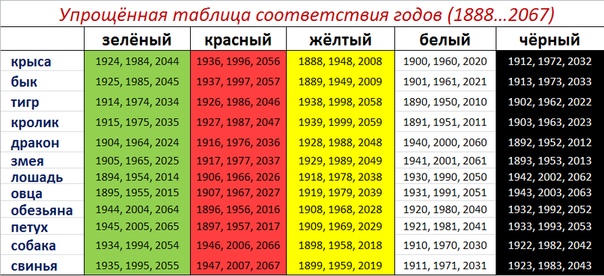 | Обезьяна | 1908, 1920, 1932, 1944, 1956, 1968, 1980, 1992, 2004, 2016, 2028 |