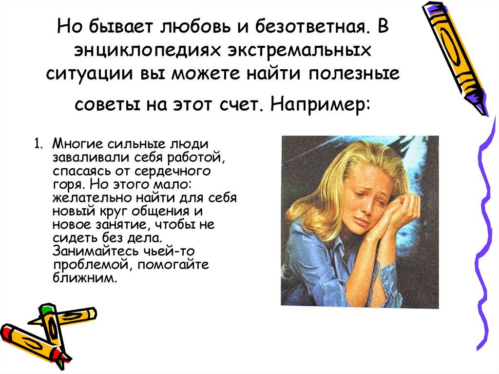 - Не заводите новые романы быстро. Дайте себе остыть. А пока остываете, наполняйте себя всем ,на что не хватало времени раньше, однако важно посмотреть, как это происходит у других безответно любящих.