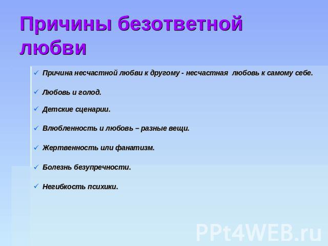 К несчастью, любовь не всегда приносит человеку чувство радости и удовлетворения. Безответные чувства разрушают самооценку, заставляют страдать. Лишь единицы умеют легко переживать такие неприятные эмоции, быстро переключая свое внимание на другие жизненные дела.